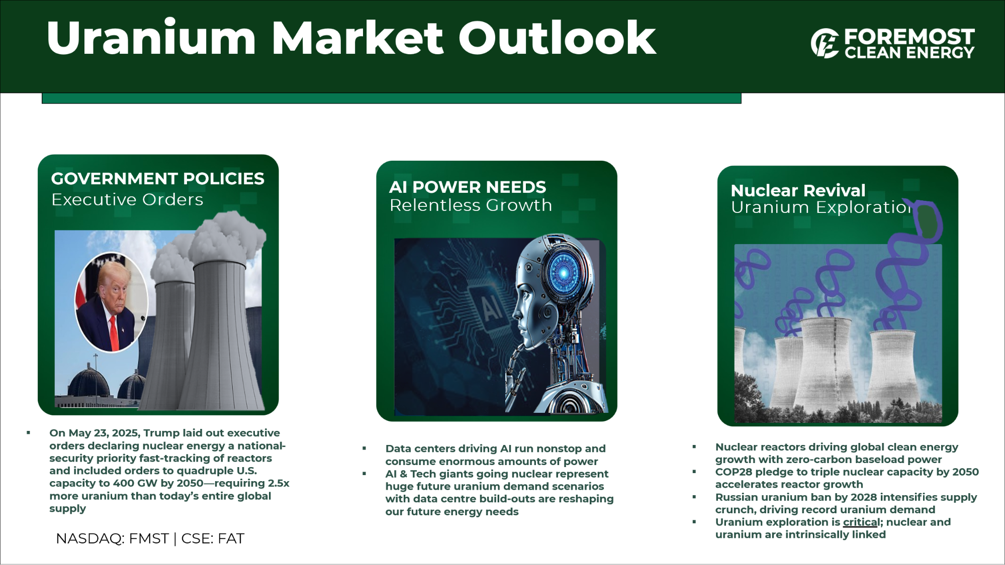 These sweeping measures represent the most significant demand catalyst for uranium in half a century, structurally repositioning supply chains and accelerating timelines for companies like Foremost Clean Energy (FMST).